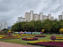 경산시가 가을을 맞아 남천둔치 시정구호화단에 다채로운 국화 전시를 선보이며 시민들에게 쾌적한 가을 산책 공간을 제공하고 있다.