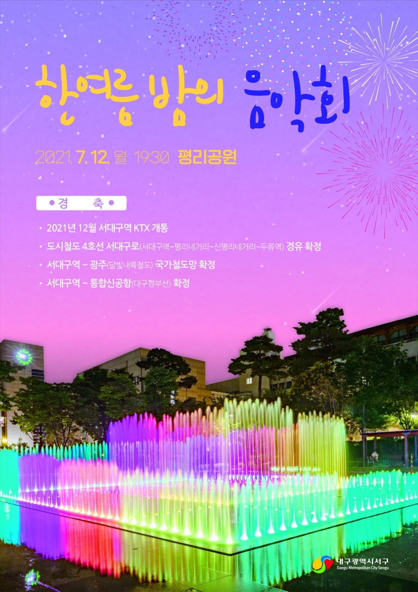 최근 서구는 도시철도 4호선 트램의 서대구로(서대구역~평리R~신평리R~두류역) 경유 확정, 서대구역 ~ 광주(달빛내륙철도) 국가철도망 확정 등으로 새 시대의 중심으로 힘찬 발돋움으로 비상하고 있으며, 또한 평리공원 분수광장의 새 단장을 기념하여 주민들에게 멋진 고품격 음악회를 진행한다.