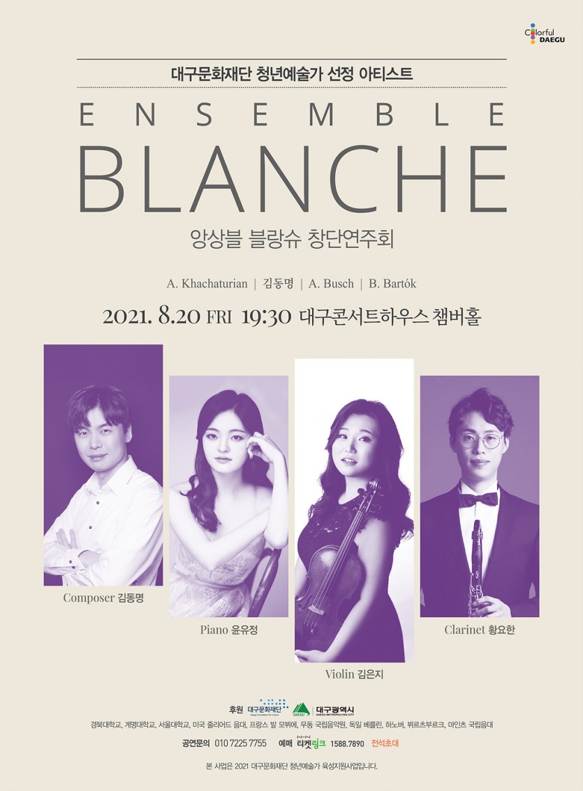 올해로 5기를 맞은 대구문화재단 “청년예술가육성지원사업”은 지역의 유망한 청년예술가를 발굴하는 사업으로 지난해 4월 대구 지역의 만 35세 이하 청년예술인 15명을 선정했고 그중 음악 부문 선정자 4명 작곡 김동명, 바이올린 김은지, 피아노 윤유정, 클라리넷 황요한 4명 이 이번 공연을 준비했다.